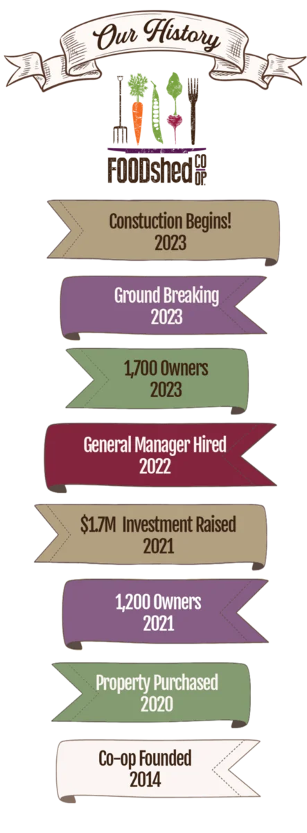 To honor the dedication and all of the hard work contributed by hundreds of owner-member volunteers, who have tirelessly worked to bring the Food Shed Co-op to McHenry County, please consider becoming a FOUNDING owner-member before the store opens and make your plans to shop often at the Food Shed Co-op when we open in 2024.